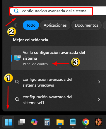 | 💎 Este procedimiento suele ser algo muy comun pero tiene una solucion rapida: ➖ 1) Primero presionas la tecla "WINDOWS" o bien presionas sobre el icono de WINDOWS ➖ 2) Escribes en el buscador lo siguiente: "Configuracion avanzada del sistema". ➖ 3) Finalmente seleccionas el primer resultado y das click. |