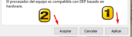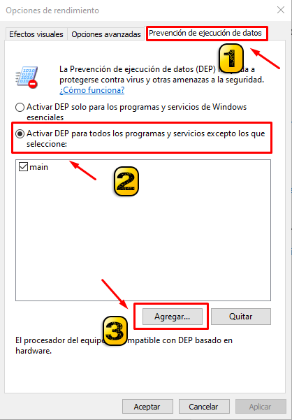 | 🟠 Como se muestra en la imagen ➖ 1) Primero, damos click en la ventana que dice "prevención de ejecución de datos" ➖ 2) Seguido, click en la opción de "activar DEP". ➖ 3) Por ultimo, en donde dice "agregar" |