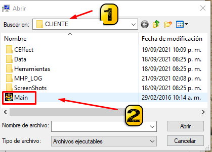 | 🟠 Se abrirá una ventana donde deben buscar la carpeta donde instalaron el MU, seguido seleccionan el main y le dan a abrir. |